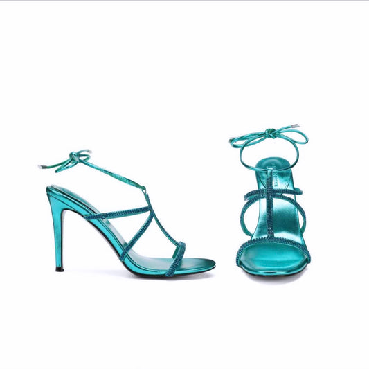 DARELLE RHINESTONE EMBELLISHED METALLIC LEATHER SANDALS IN TURQUOISE
